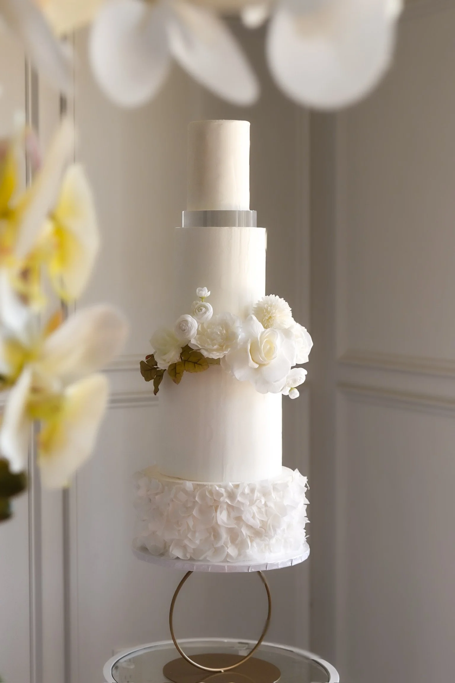 “Gilded Petals” is an extra-tall and majestic four-tiered white wedding cake that exudes elegance from every angle.