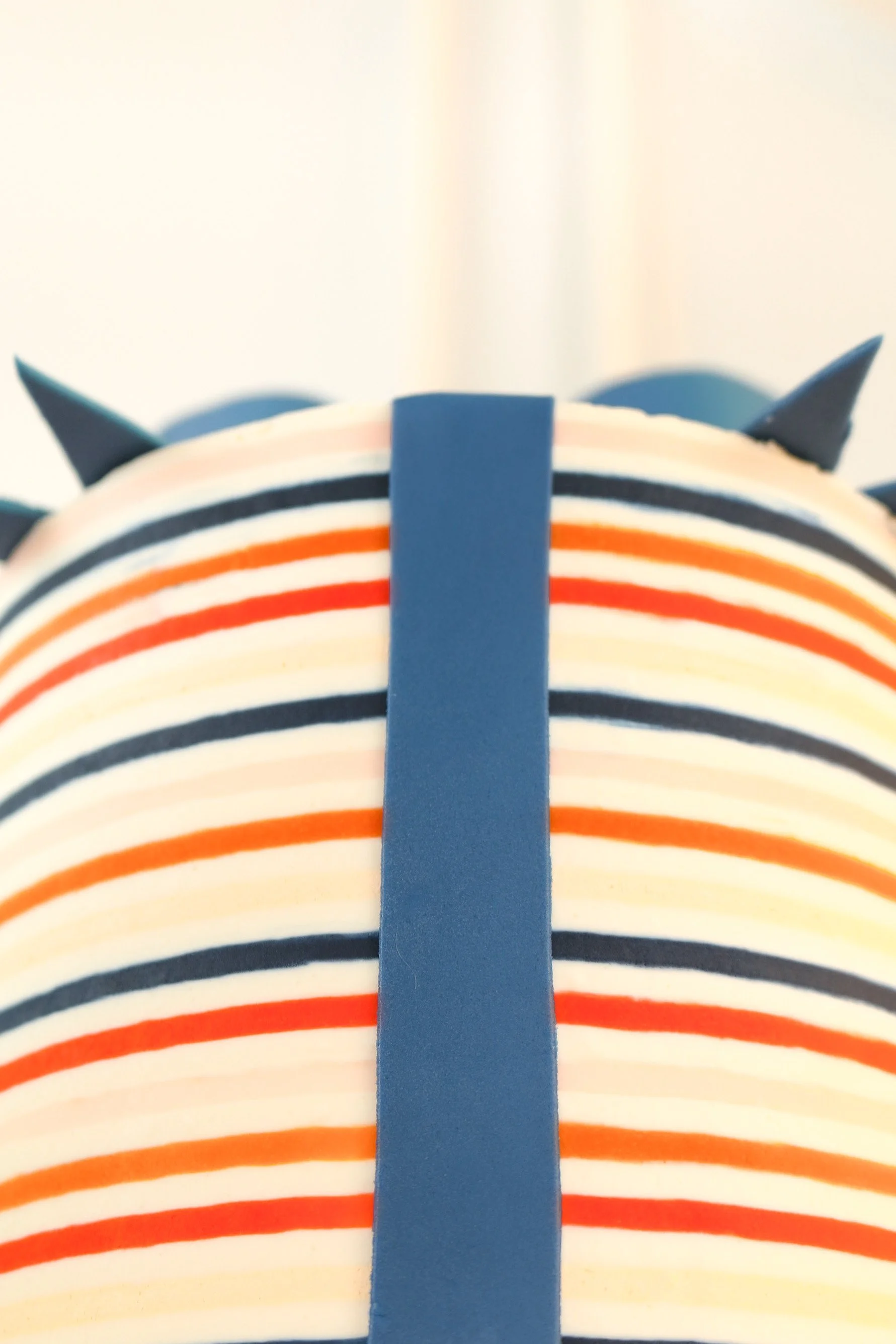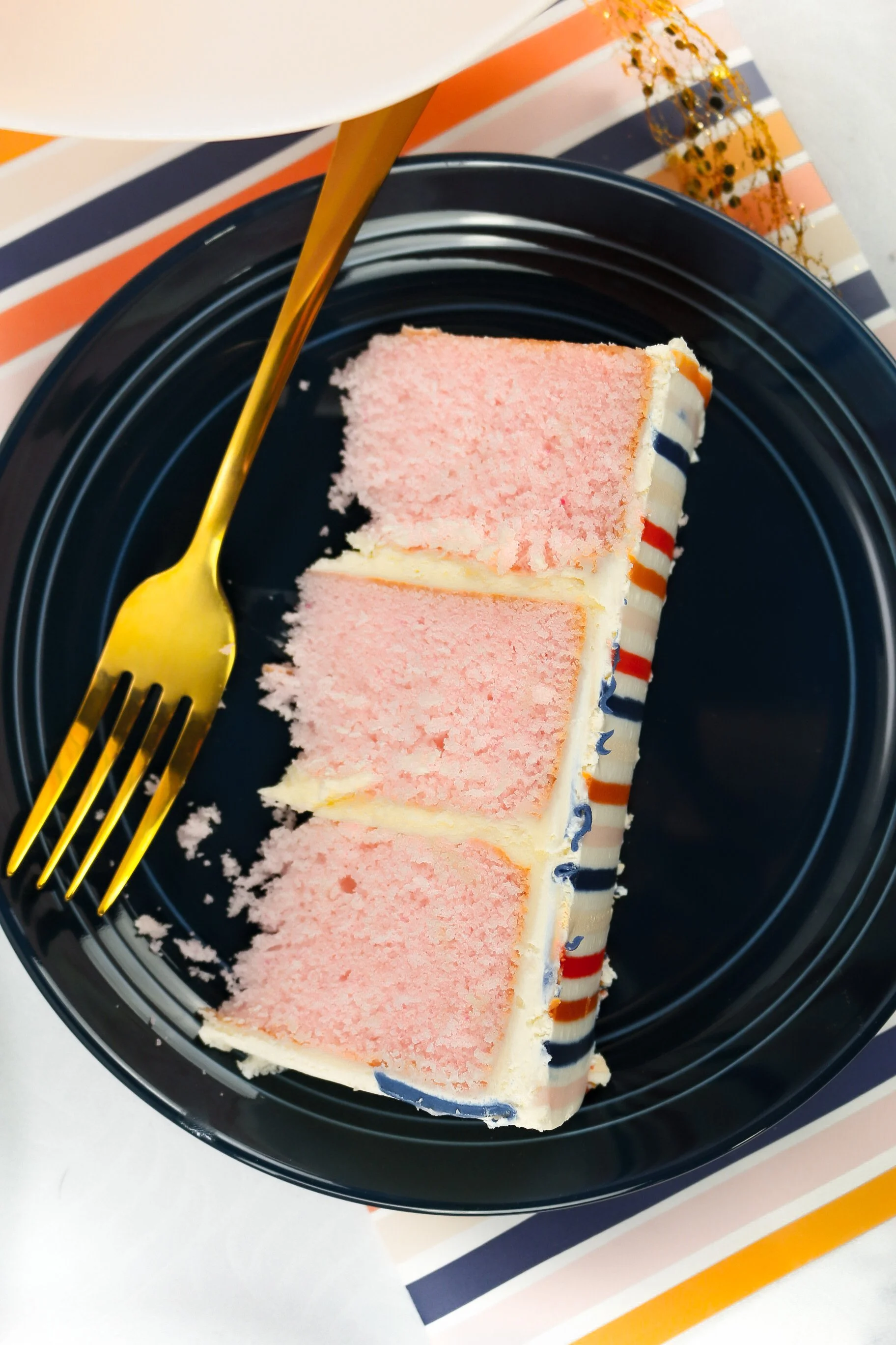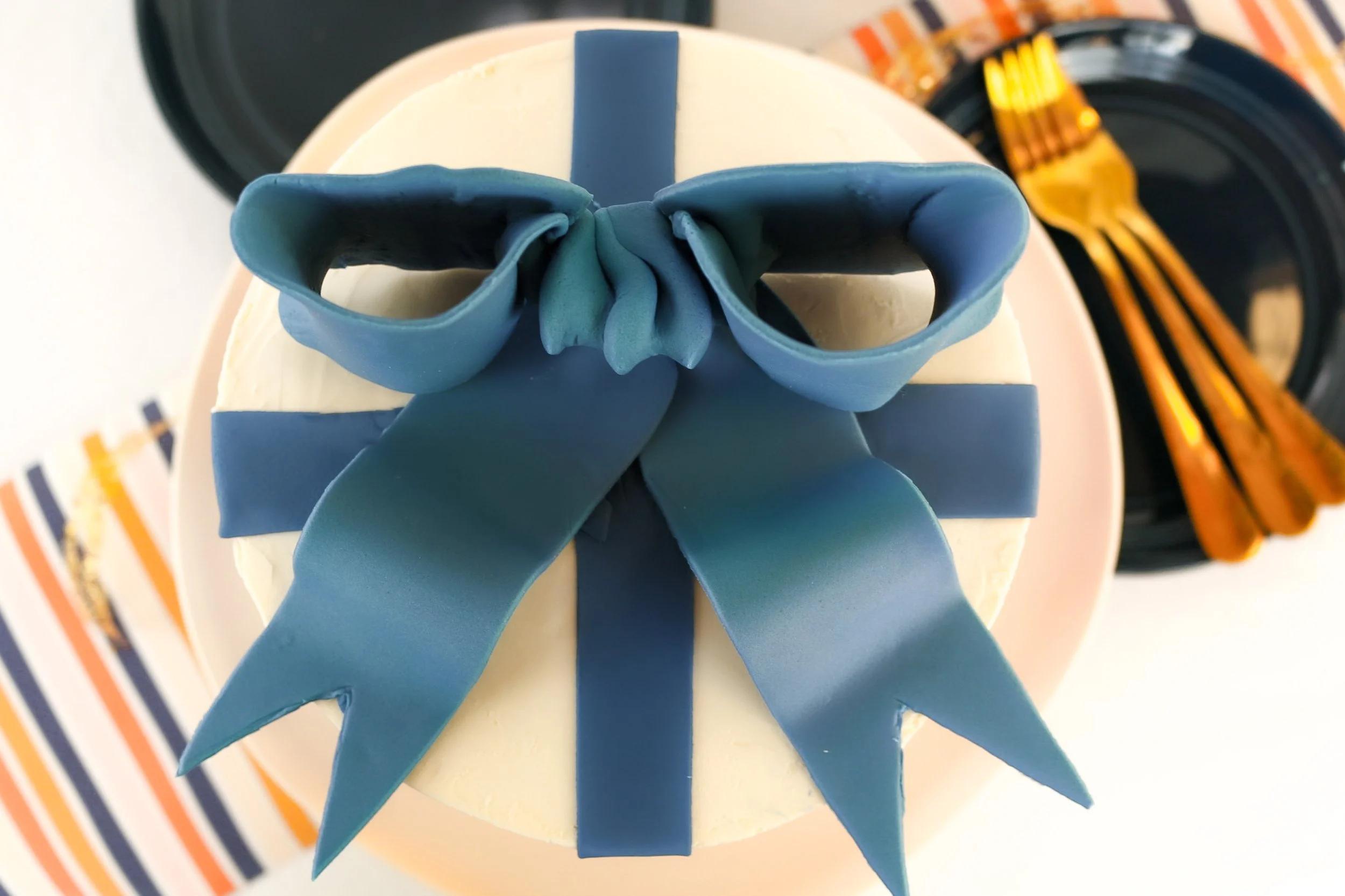 The “bow” and ribbon are navy fondant. I don’t like eating fondant, so I remove as many fondant decorations from my cake before digging in. Easy peasy.