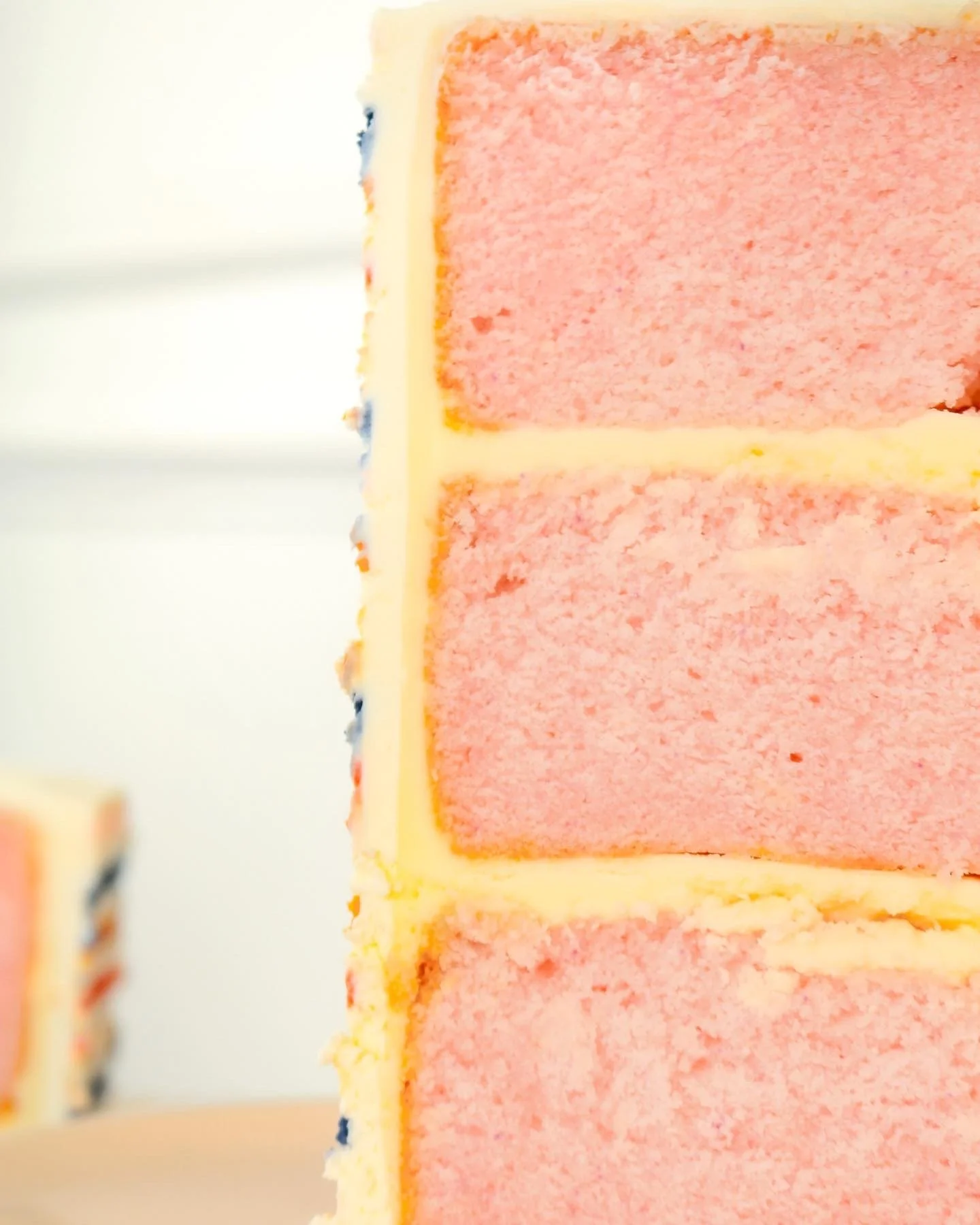 And last but certainly not least, we’ve got a PINK velvet cake inside. I omitted the Red Velvet extract that I would normally use, and instead added a bit of citrus extract and pink food coloring. But yes - this cake still has cocoa powder in it!